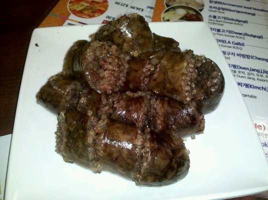 On Bizarre Foods, Andrew Zimmern tries their Soondae Plate or their Blood Sausage. In walking in his footsteps, lets order away and try it out. I just ordered a sample plate of it and it is really surprising it. It's cooked really well with the casing being super delicate and the flavors are very mild. You do not have any metallic or mineral heavy dense flavor. It's rather light and the blood only gives is a small subtle enhanced flavor. The rice inside is well textured and wonderfully soft. This was a good choice.